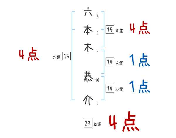 総運![]() | 六本木恭介さんの総運は29画の4つ星!完全主義で才能がある。厳格な心の持ち主。 あなたの人生を表す1番重要な運勢です。生涯を通じて影響する総合運となり、主に50歳以降の晩年期に影響を及ぼします。 |