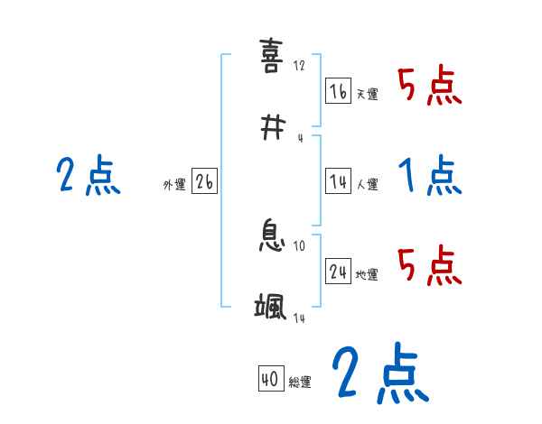 天運![]() | 喜井息颯さんの天運は16画の5つ星!人望が厚く大きく発展する。逆転成功が見える。 家系が持つ宿命的な運勢を表します。祖先から受け継いだ苗字ですので自分の力が及びません。家柄を象徴します。 |