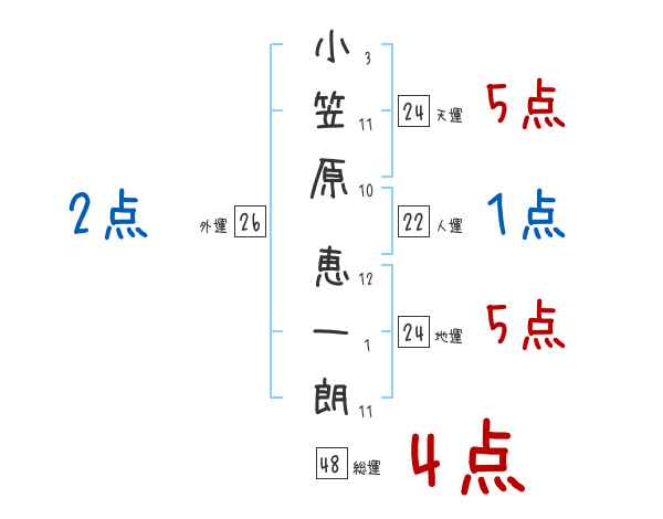 天運![]() | 小笠原恵一朗さんの天運は24画の5つ星!家庭運が良く順調な人生。金運にも恵まれる。 家系が持つ宿命的な運勢を表します。祖先から受け継いだ苗字ですので自分の力が及びません。家柄を象徴します。 |