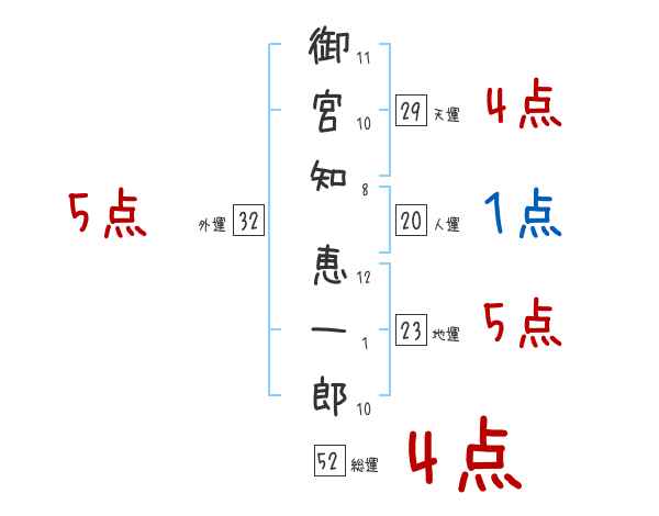 外運![]() | 御宮知恵一郎さんの外運は32画の5つ星!柔軟性があり成功する。チャンスが多く金運が良い。 生活面を象徴する運勢です。外部から受ける影響力を表し、結婚運、家庭運や職場、環境への順応性を表します。 |
