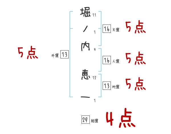 人運![]() | 堀ノ内恵一さんの人運は16画の5つ星!人望が厚く大きく発展する。逆転成功が見える。 性格や才能などを表す2番目に重要な運勢です。人間関係や協調性、社会的な成功に影響します。主に20歳から50歳ぐらいまでの中年期の運勢を表します。 |
