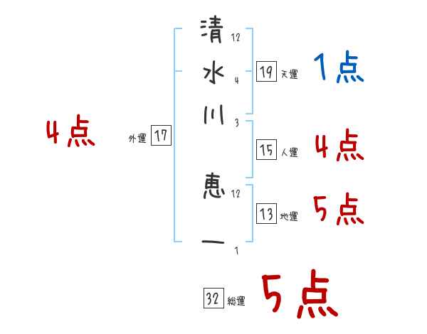 総運![]() | 清水川恵一さんの総運は32画の5つ星!柔軟性があり成功する。チャンスが多く金運が良い。 あなたの人生を表す1番重要な運勢です。生涯を通じて影響する総合運となり、主に50歳以降の晩年期に影響を及ぼします。 |