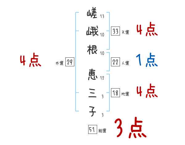 外運![]() | 嵯峨根恵三子さんの外運は29画の4つ星!完全主義で才能がある。厳格な心の持ち主。 生活面を象徴する運勢です。外部から受ける影響力を表し、結婚運、家庭運や職場、環境への順応性を表します。 |