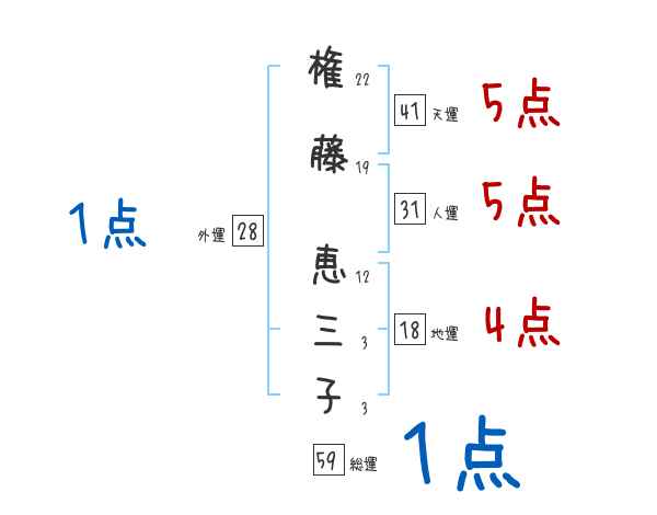 天運![]() | 権藤恵三子さんの天運は41画の5つ星!大志を抱き、目標に向かって実力を発揮し達成する。温和な性格。 家系が持つ宿命的な運勢を表します。祖先から受け継いだ苗字ですので自分の力が及びません。家柄を象徴します。 |