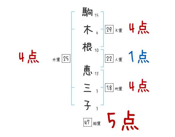 総運![]() | 駒木根恵三子さんの総運は47画の5つ星!実力が開花し発展する円満な人生。財に恵まれる。 あなたの人生を表す1番重要な運勢です。生涯を通じて影響する総合運となり、主に50歳以降の晩年期に影響を及ぼします。 |