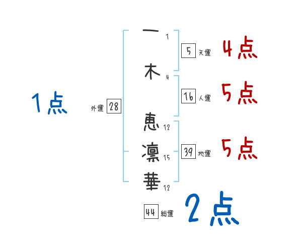 人運![]() | 一木恵凛華さんの人運は16画の5つ星!人望が厚く大きく発展する。逆転成功が見える。 性格や才能などを表す2番目に重要な運勢です。人間関係や協調性、社会的な成功に影響します。主に20歳から50歳ぐらいまでの中年期の運勢を表します。 |