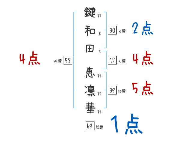 外運![]() | 鍵和田恵凛華さんの外運は52画の4つ星!先見性と独創性に優れ考える力がある。強運の持ち主。 生活面を象徴する運勢です。外部から受ける影響力を表し、結婚運、家庭運や職場、環境への順応性を表します。 |