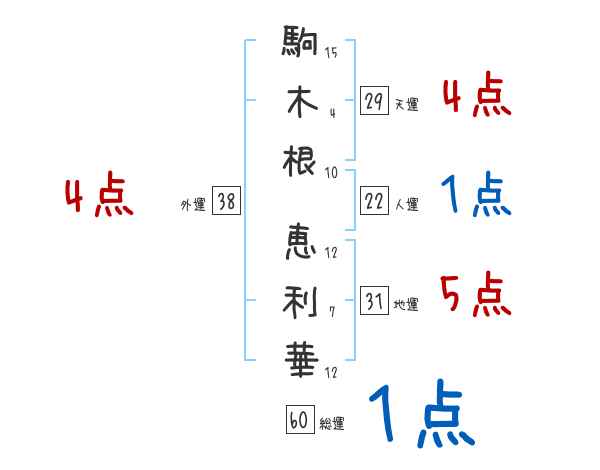 天運![]() | 駒木根恵利華さんの天運は29画の4つ星!完全主義で才能がある。厳格な心の持ち主。 家系が持つ宿命的な運勢を表します。祖先から受け継いだ苗字ですので自分の力が及びません。家柄を象徴します。 |