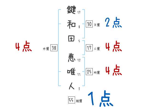 天運![]() | 鍵和田恵唯人さんの天運は30画の2つ星!浮き沈みの激しさに注意しましょう。 家系が持つ宿命的な運勢を表します。祖先から受け継いだ苗字ですので自分の力が及びません。家柄を象徴します。 |