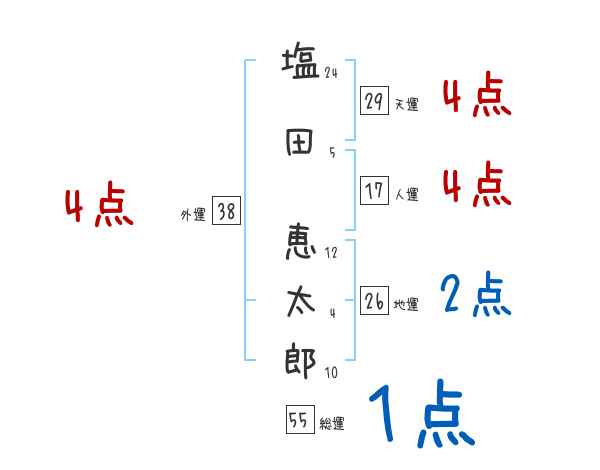 外運![]() | 塩田恵太郎さんの外運は38画の4つ星!温厚な性格で技術的な才能を発揮する。職人的な仕事に向いている。 生活面を象徴する運勢です。外部から受ける影響力を表し、結婚運、家庭運や職場、環境への順応性を表します。 |
