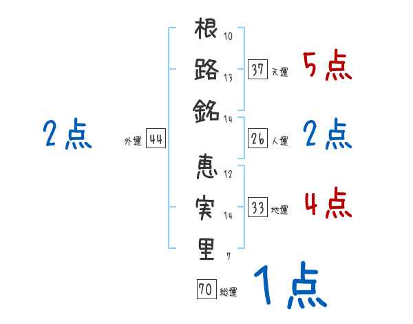 外運![]() | 根路銘恵実里さんの外運は44画の2つ星!誠実で慎重な性格。物事を考えすぎないように注意しましょう。 生活面を象徴する運勢です。外部から受ける影響力を表し、結婚運、家庭運や職場、環境への順応性を表します。 |