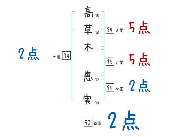 人運![]() | 高草木恵実さんの人運は16画の5つ星!人望が厚く大きく発展する。逆転成功が見える。 性格や才能などを表す2番目に重要な運勢です。人間関係や協調性、社会的な成功に影響します。主に20歳から50歳ぐらいまでの中年期の運勢を表します。 |