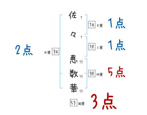 総運![]() | 佐々恵数華さんの総運は53画の3つ星!やや見栄っ張りで虚栄心がある。散財に注意。 あなたの人生を表す1番重要な運勢です。生涯を通じて影響する総合運となり、主に50歳以降の晩年期に影響を及ぼします。 |