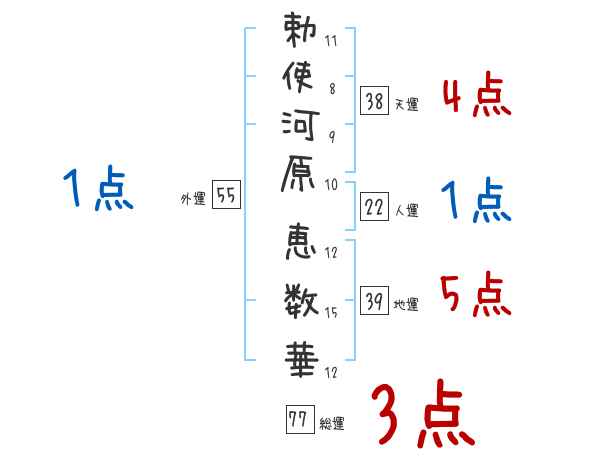 天運![]() | 勅使河原恵数華さんの天運は38画の4つ星!温厚な性格で技術的な才能を発揮する。職人的な仕事に向いている。 家系が持つ宿命的な運勢を表します。祖先から受け継いだ苗字ですので自分の力が及びません。家柄を象徴します。 |