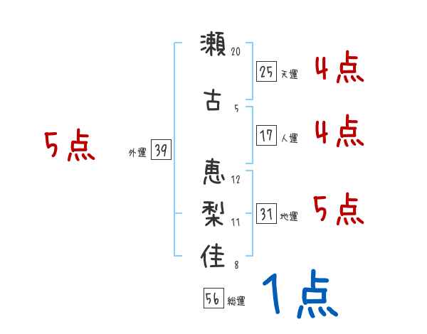 外運![]() | 瀬古恵梨佳さんの外運は39画の5つ星!社交性に優れ人望が厚い。人の上に立ち成功する。 生活面を象徴する運勢です。外部から受ける影響力を表し、結婚運、家庭運や職場、環境への順応性を表します。 |