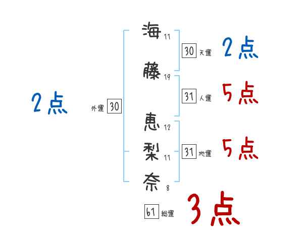 天運![]() | 海藤恵梨奈さんの天運は30画の2つ星!浮き沈みの激しさに注意しましょう。 家系が持つ宿命的な運勢を表します。祖先から受け継いだ苗字ですので自分の力が及びません。家柄を象徴します。 |