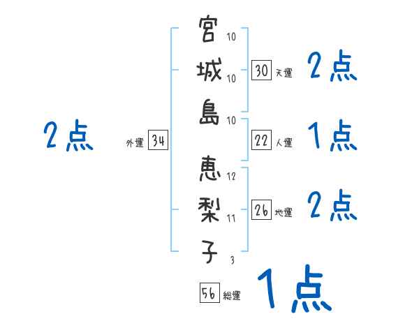 天運![]() | 宮城島恵梨子さんの天運は30画の2つ星!浮き沈みの激しさに注意しましょう。 家系が持つ宿命的な運勢を表します。祖先から受け継いだ苗字ですので自分の力が及びません。家柄を象徴します。 |