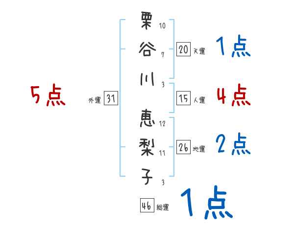 外運![]() | 栗谷川恵梨子さんの外運は31画の5つ星!社交性があり判断力に優れる。順風満帆な人生で円満な生活。 生活面を象徴する運勢です。外部から受ける影響力を表し、結婚運、家庭運や職場、環境への順応性を表します。 |