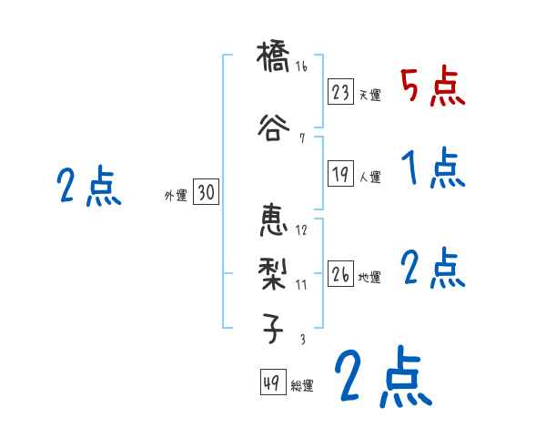 天運![]() | 橋谷恵梨子さんの天運は23画の5つ星!想像力に優れ活力がある。一代で成功し名誉を手に入れる。 家系が持つ宿命的な運勢を表します。祖先から受け継いだ苗字ですので自分の力が及びません。家柄を象徴します。 |