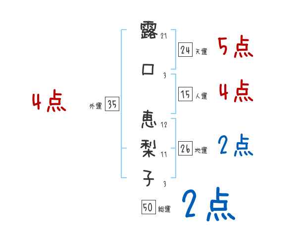 総運![]() | 露口恵梨子さんの総運は50画の2つ星!浮き沈みが激しく不安定。しりすぼみに衰退しやすいので注意しましょう。 あなたの人生を表す1番重要な運勢です。生涯を通じて影響する総合運となり、主に50歳以降の晩年期に影響を及ぼします。 |