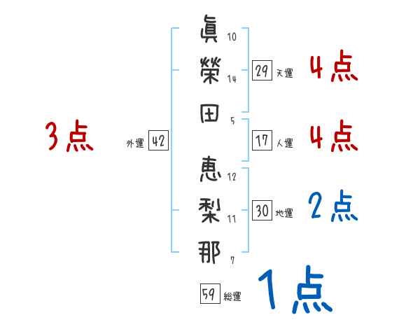 外運![]() | 眞榮田恵梨那さんの外運は42画の3つ星!病気に注意。多芸であるが消極的でおとなしい。 生活面を象徴する運勢です。外部から受ける影響力を表し、結婚運、家庭運や職場、環境への順応性を表します。 |