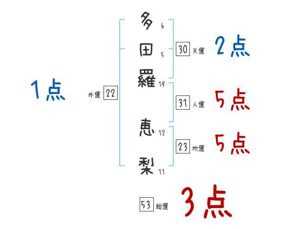 外運![]() | 多田羅恵梨さんの外運は22画の1つ星!努力することが苦手ないっぽう手先が器用。芸術性にも優れる。 生活面を象徴する運勢です。外部から受ける影響力を表し、結婚運、家庭運や職場、環境への順応性を表します。 |