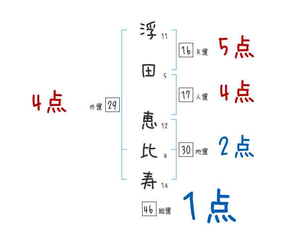 天運![]() | 浮田恵比寿さんの天運は16画の5つ星!人望が厚く大きく発展する。逆転成功が見える。 家系が持つ宿命的な運勢を表します。祖先から受け継いだ苗字ですので自分の力が及びません。家柄を象徴します。 |