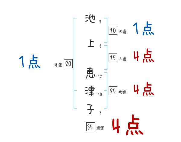 天運![]() | 池上恵津子さんの天運は10画の1つ星!不安を感じやすい傾向。ストレスを抱えないように注意しましょう。 家系が持つ宿命的な運勢を表します。祖先から受け継いだ苗字ですので自分の力が及びません。家柄を象徴します。 |
