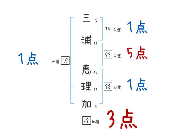 外運![]() | 三浦恵理加さんの外運は19画の1つ星!優れた才能を持ちますが、協調性が足りないことも。周りの人と協力する事を意識しましょう。 生活面を象徴する運勢です。外部から受ける影響力を表し、結婚運、家庭運や職場、環境への順応性を表します。 |