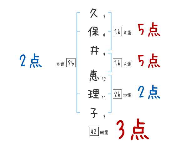 人運![]() | 久保井恵理子さんの人運は16画の5つ星!人望が厚く大きく発展する。逆転成功が見える。 性格や才能などを表す2番目に重要な運勢です。人間関係や協調性、社会的な成功に影響します。主に20歳から50歳ぐらいまでの中年期の運勢を表します。 |