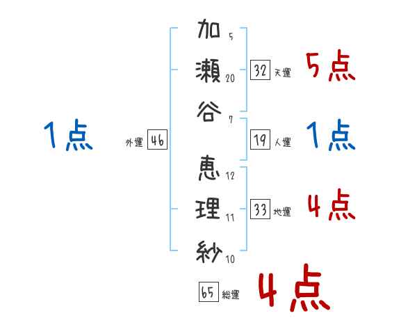 天運![]() | 加瀬谷恵理紗さんの天運は32画の5つ星!柔軟性があり成功する。チャンスが多く金運が良い。 家系が持つ宿命的な運勢を表します。祖先から受け継いだ苗字ですので自分の力が及びません。家柄を象徴します。 |