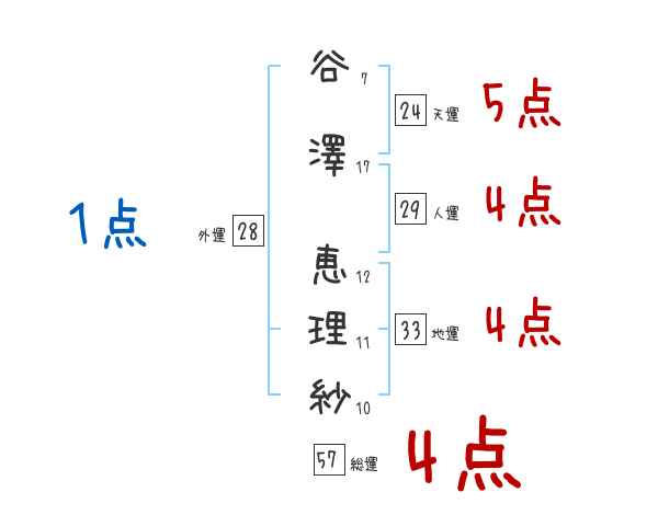 外運![]() | 谷澤恵理紗さんの外運は28画の1つ星!家庭環境に注意。スポーツで活躍できる能力があるかも。 生活面を象徴する運勢です。外部から受ける影響力を表し、結婚運、家庭運や職場、環境への順応性を表します。 |