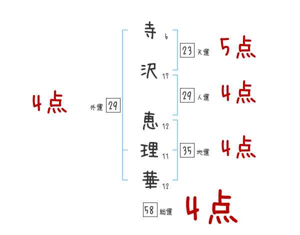 外運![]() | 寺沢恵理華さんの外運は29画の4つ星!完全主義で才能がある。厳格な心の持ち主。 生活面を象徴する運勢です。外部から受ける影響力を表し、結婚運、家庭運や職場、環境への順応性を表します。 |