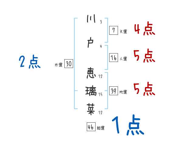 天運![]() | 川戸恵璃菜さんの天運は7画の4つ星!強い意志や信念を持ち独立心が強い。自立する。 家系が持つ宿命的な運勢を表します。祖先から受け継いだ苗字ですので自分の力が及びません。家柄を象徴します。 |