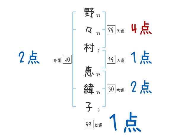 天運![]() | 野々村恵緯子さんの天運は29画の4つ星!完全主義で才能がある。厳格な心の持ち主。 家系が持つ宿命的な運勢を表します。祖先から受け継いだ苗字ですので自分の力が及びません。家柄を象徴します。 |