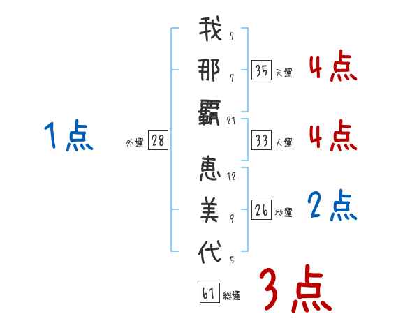 天運![]() | 我那覇恵美代さんの天運は35画の4つ星!温厚な性格で感受性が高い。穏和な性格で人望が厚い。 家系が持つ宿命的な運勢を表します。祖先から受け継いだ苗字ですので自分の力が及びません。家柄を象徴します。 |