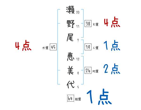 外運![]() | 瀬野尾恵美代さんの外運は45画の4つ星!もくもくと物事を進め達成する。地味な努力家。 生活面を象徴する運勢です。外部から受ける影響力を表し、結婚運、家庭運や職場、環境への順応性を表します。 |