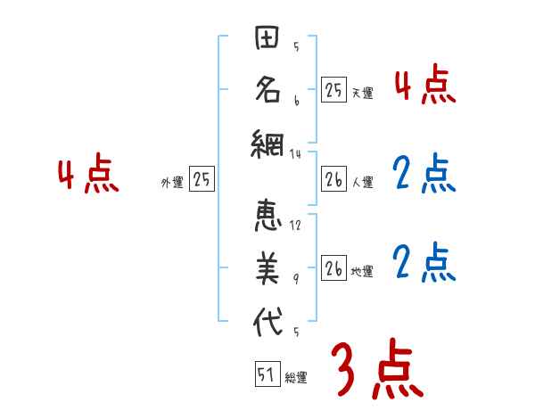 天運![]() | 田名網恵美代さんの天運は25画の4つ星!個性があり才能があふれる。強運の持ち主で発展する。 家系が持つ宿命的な運勢を表します。祖先から受け継いだ苗字ですので自分の力が及びません。家柄を象徴します。 |