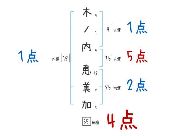 天運![]() | 木ノ内恵美加さんの天運は9画の1つ星!消極的で才能を発揮することが苦手なことも。周りの意見に耳を傾けましょう。 家系が持つ宿命的な運勢を表します。祖先から受け継いだ苗字ですので自分の力が及びません。家柄を象徴します。 |