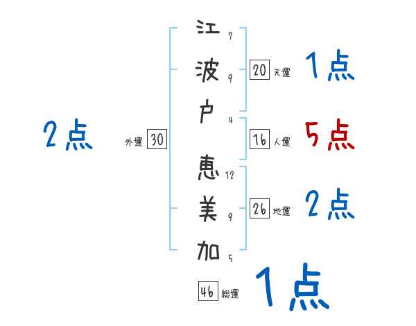 人運![]() | 江波戸恵美加さんの人運は16画の5つ星!人望が厚く大きく発展する。逆転成功が見える。 性格や才能などを表す2番目に重要な運勢です。人間関係や協調性、社会的な成功に影響します。主に20歳から50歳ぐらいまでの中年期の運勢を表します。 |