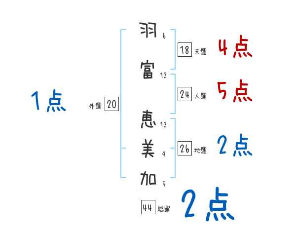 天運![]() | 羽富恵美加さんの天運は18画の4つ星!情熱的で剛気。忍耐力があり信頼される。 家系が持つ宿命的な運勢を表します。祖先から受け継いだ苗字ですので自分の力が及びません。家柄を象徴します。 |