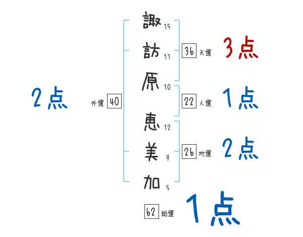 天運![]() | 諏訪原恵美加さんの天運は36画の3つ星!先見性が豊かです。多少神経質で苦労することも。 家系が持つ宿命的な運勢を表します。祖先から受け継いだ苗字ですので自分の力が及びません。家柄を象徴します。 |