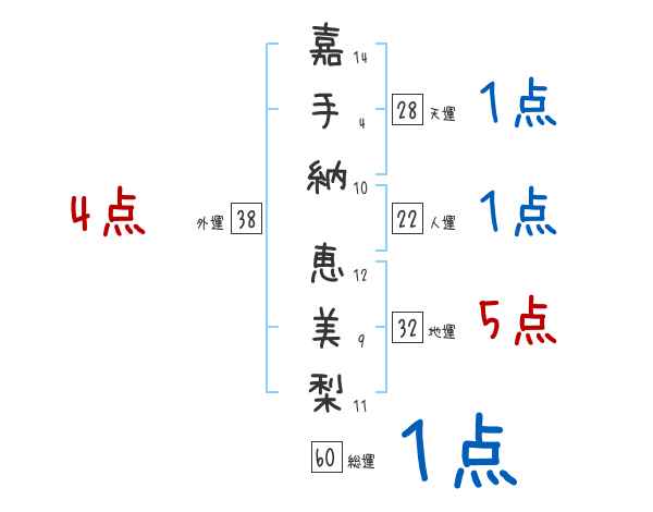 天運![]() | 嘉手納恵美梨さんの天運は28画の1つ星!家庭環境に注意。スポーツで活躍できる能力があるかも。 家系が持つ宿命的な運勢を表します。祖先から受け継いだ苗字ですので自分の力が及びません。家柄を象徴します。 |