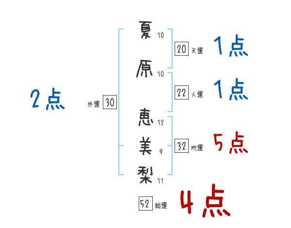 地運![]() | 夏原恵美梨さんの地運は32画の5つ星!柔軟性があり成功する。チャンスが多く金運が良い。 個性を表す基礎的な運勢です。性格形成や対人関係、行動力など家庭環境に影響されます。主に誕生してから20歳くらいまでの若年期の運勢を表します。 |