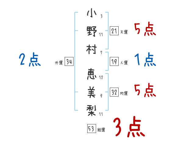 天運![]() | 小野村恵美梨さんの天運は21画の5つ星!統率力がある。独立し成功する。名誉を手に入れる。 家系が持つ宿命的な運勢を表します。祖先から受け継いだ苗字ですので自分の力が及びません。家柄を象徴します。 |