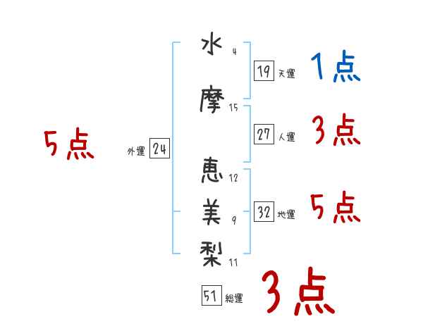 外運![]() | 水摩恵美梨さんの外運は24画の5つ星!家庭運が良く順調な人生。金運にも恵まれる。 生活面を象徴する運勢です。外部から受ける影響力を表し、結婚運、家庭運や職場、環境への順応性を表します。 |