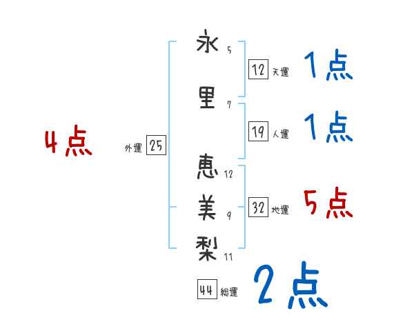 天運![]() | 永里恵美梨さんの天運は12画の1つ星!簡単な失敗で諦めてしまいやすいかも。着実に行動すると良いでしょう。 家系が持つ宿命的な運勢を表します。祖先から受け継いだ苗字ですので自分の力が及びません。家柄を象徴します。 |