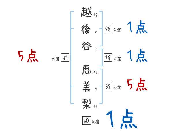 天運![]() | 越後谷恵美梨さんの天運は28画の1つ星!家庭環境に注意。スポーツで活躍できる能力があるかも。 家系が持つ宿命的な運勢を表します。祖先から受け継いだ苗字ですので自分の力が及びません。家柄を象徴します。 |