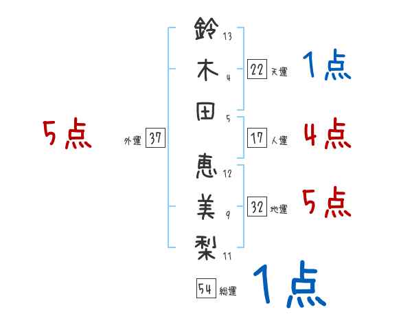 外運![]() | 鈴木田恵美梨さんの外運は37画の5つ星!努力家で順応性に優れる。現実的な考え方ができ忠実に物事をこなす。 生活面を象徴する運勢です。外部から受ける影響力を表し、結婚運、家庭運や職場、環境への順応性を表します。 |