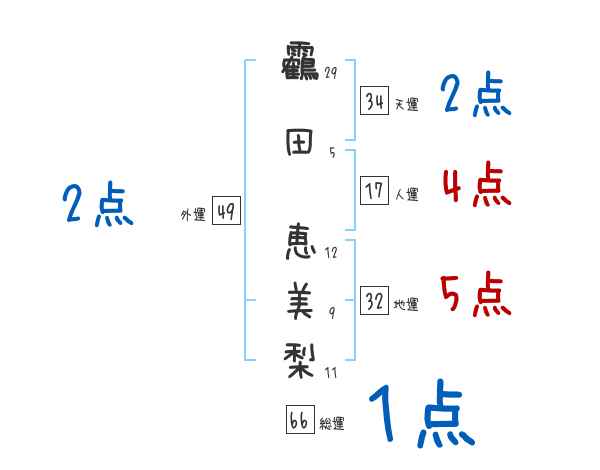 地運![]() | 靏田恵美梨さんの地運は32画の5つ星!柔軟性があり成功する。チャンスが多く金運が良い。 個性を表す基礎的な運勢です。性格形成や対人関係、行動力など家庭環境に影響されます。主に誕生してから20歳くらいまでの若年期の運勢を表します。 |